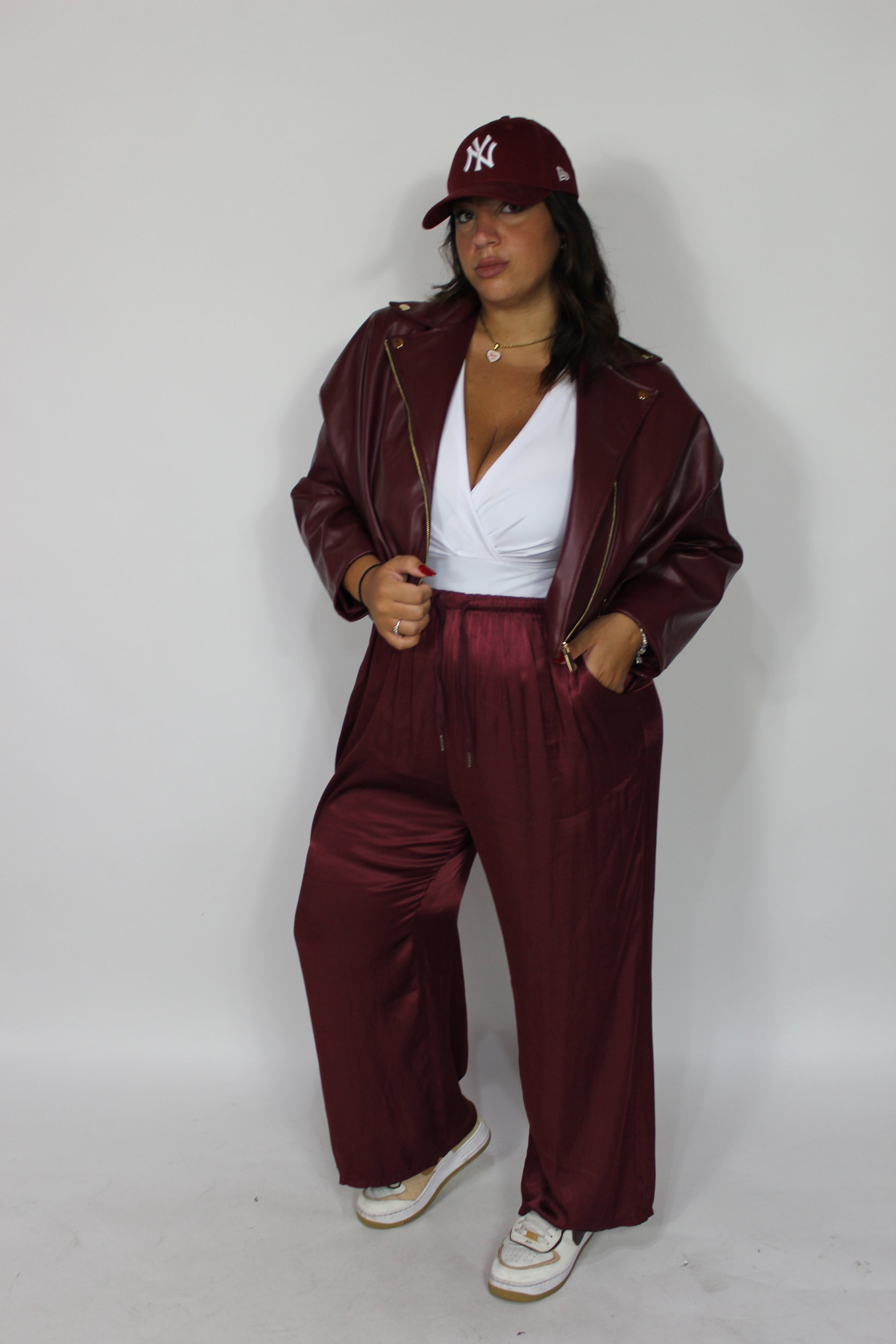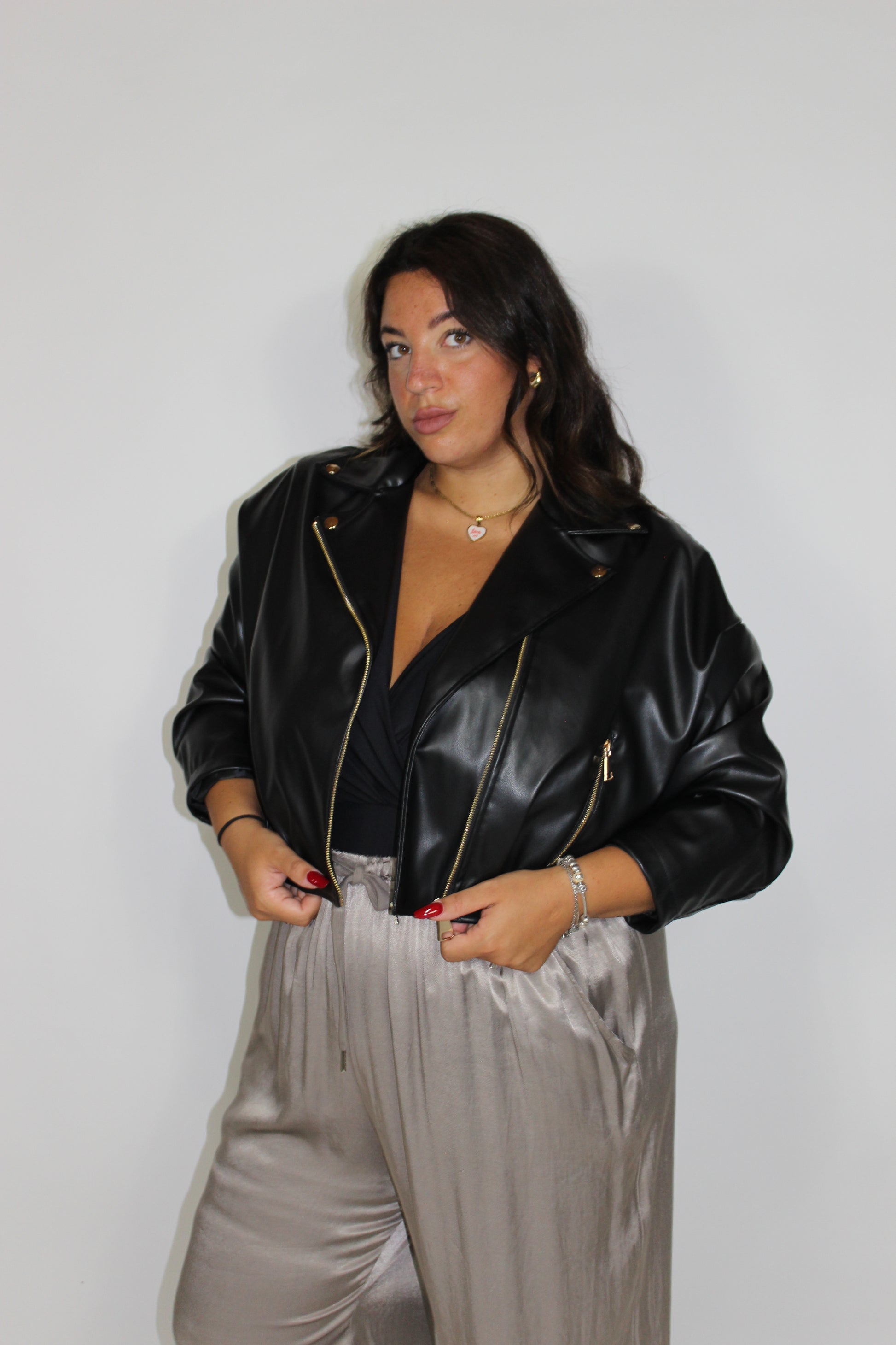 Bomber in ecopelle, chiusura doppio petto, foderato, oversize. Con elastico sul fondo e tasche con zip . Taglia unica vestibilitá da taglia 44 a 56