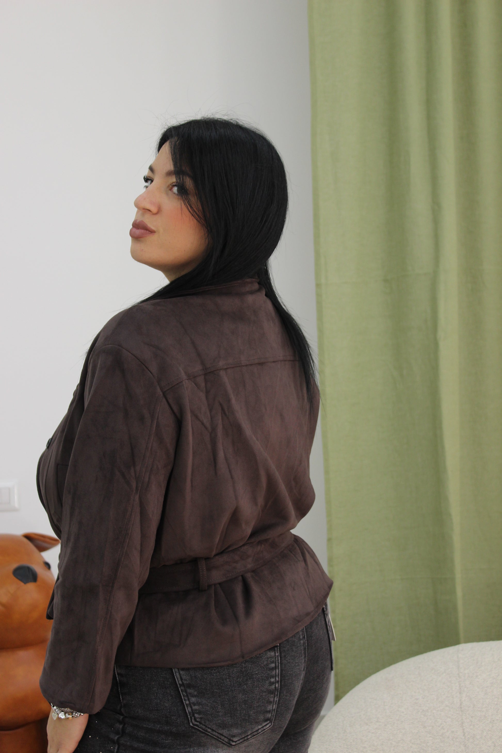 Trench crop in camoscio, doppio petto con cintura. Foderato all’interno. Taglia unica oversize. Veste da taglia 40 a 52