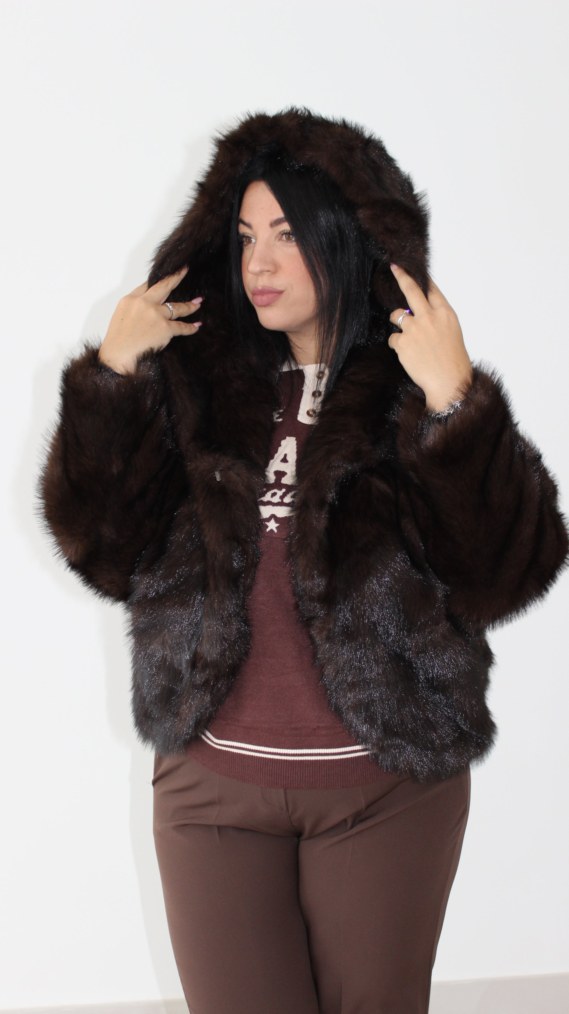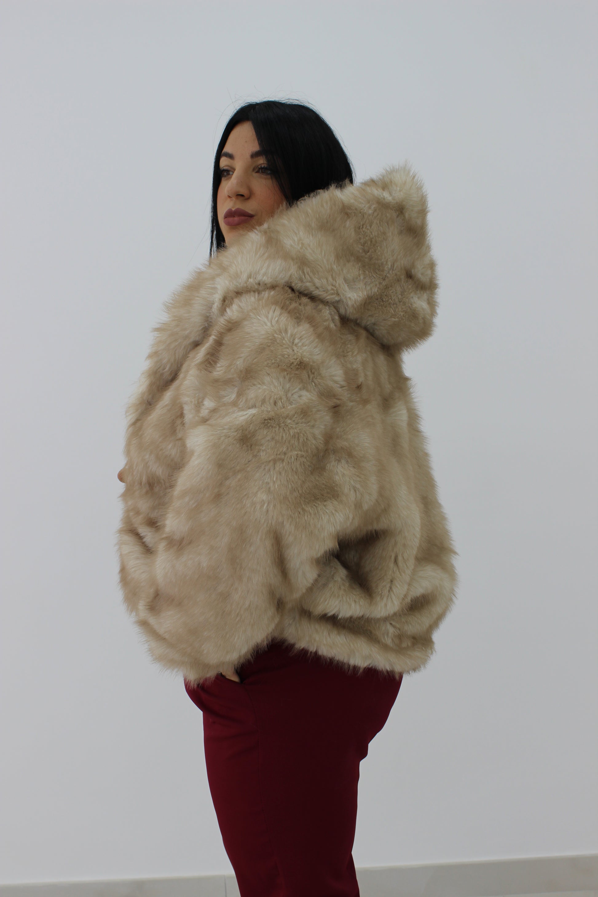Ecopelliccia foderata, con cappuccio, e gancetti per chiusura. Taglia unica oversize con vestibilitá la taglia 46 a 56