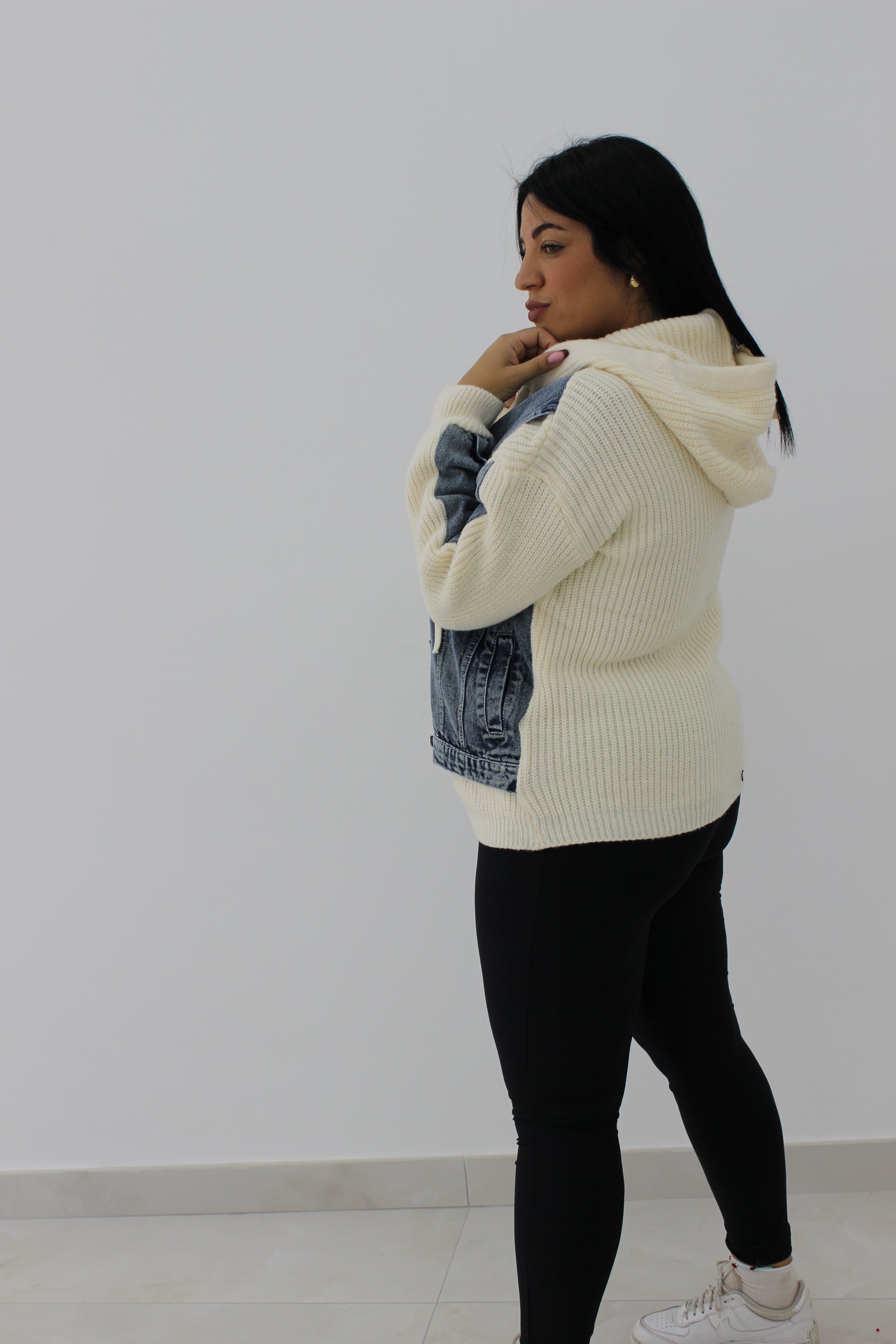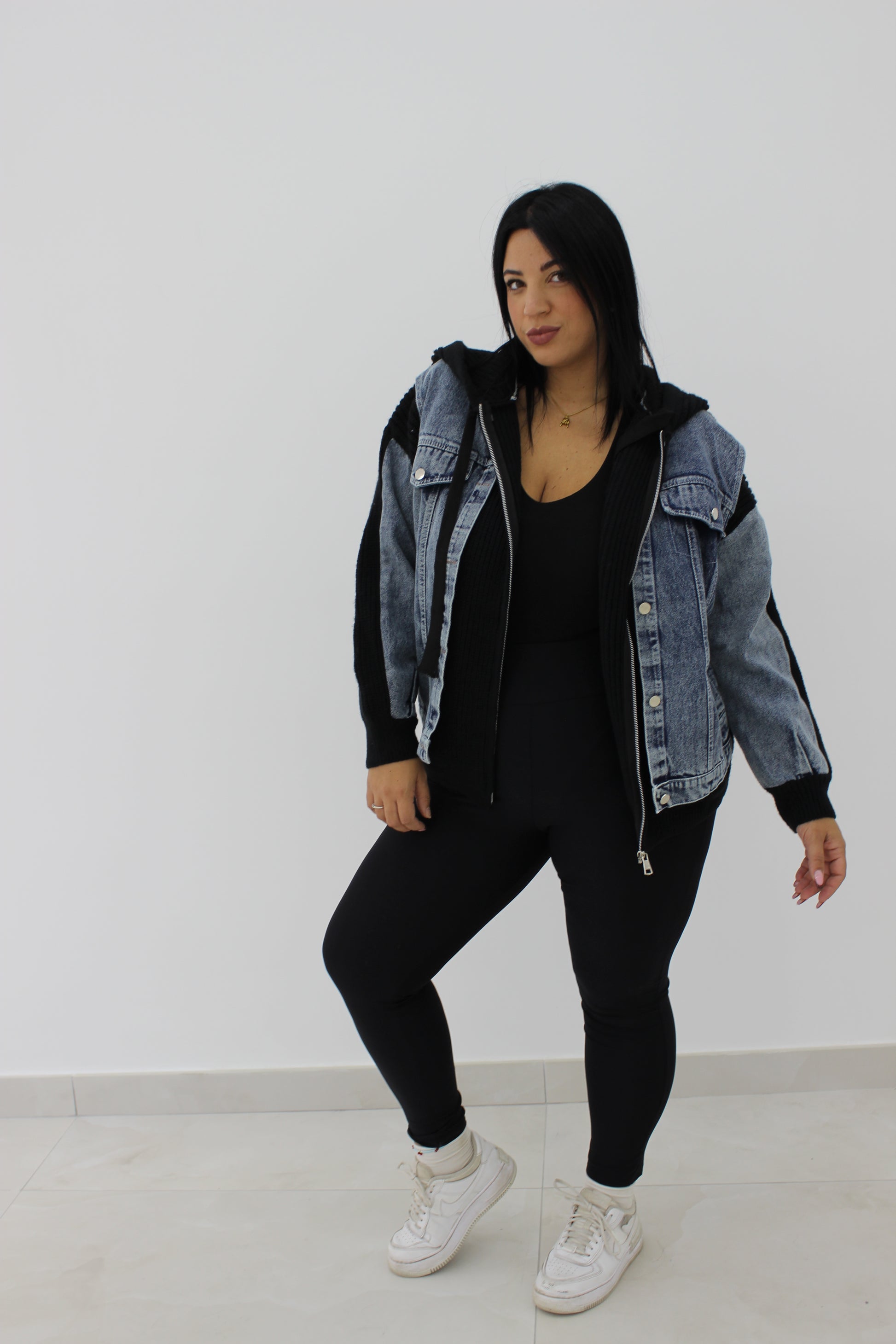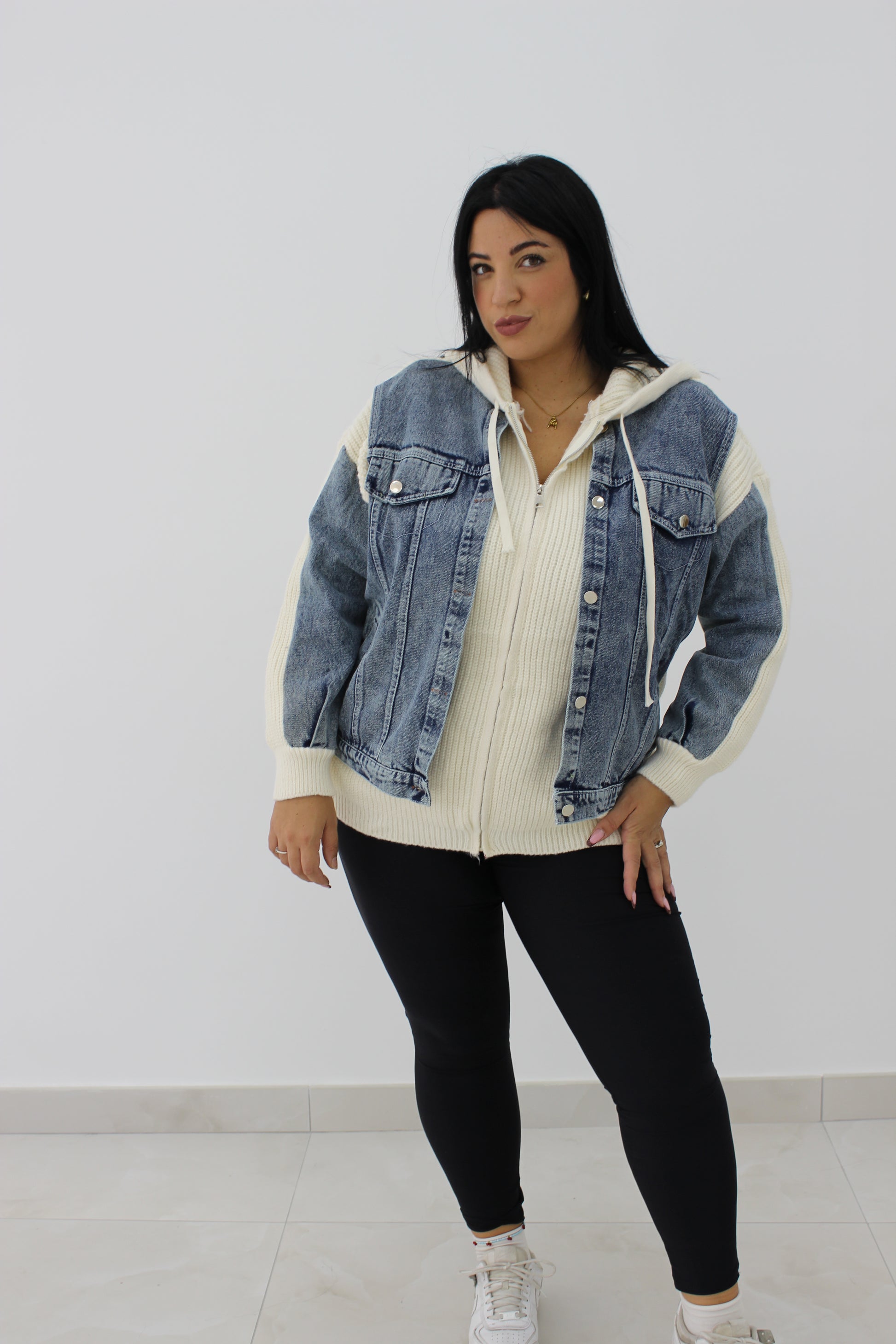 Giacca in lana, con gilet in jeans cucito. Taglia unica oversize, vestibilitá da taglia 44 a 56