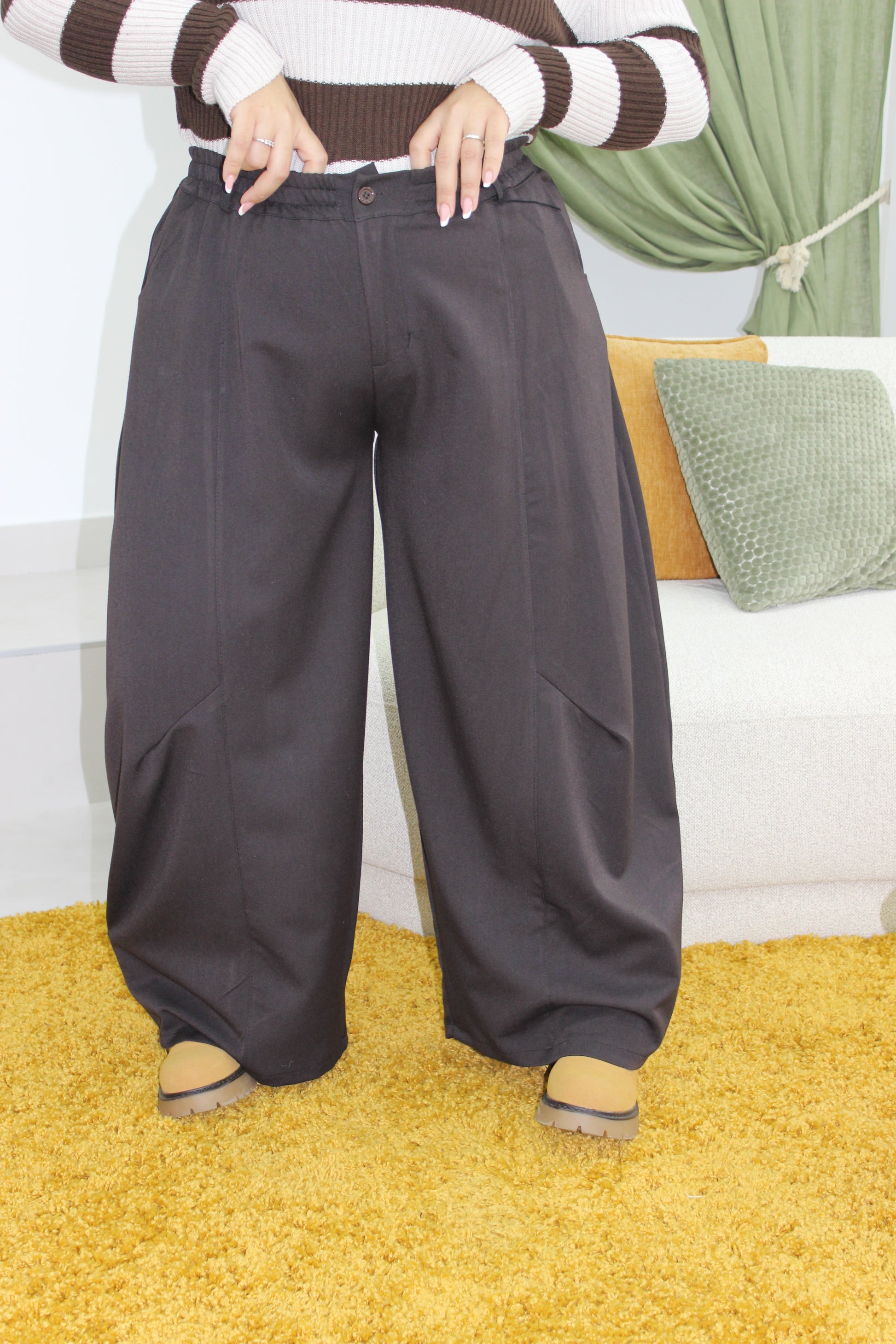 Pantalone modello ballon. Tessuto autunnale . Con tasche, zip, bottone ed elastico in vita. Taglia unica vestibilitá da taglia 48 a 56
