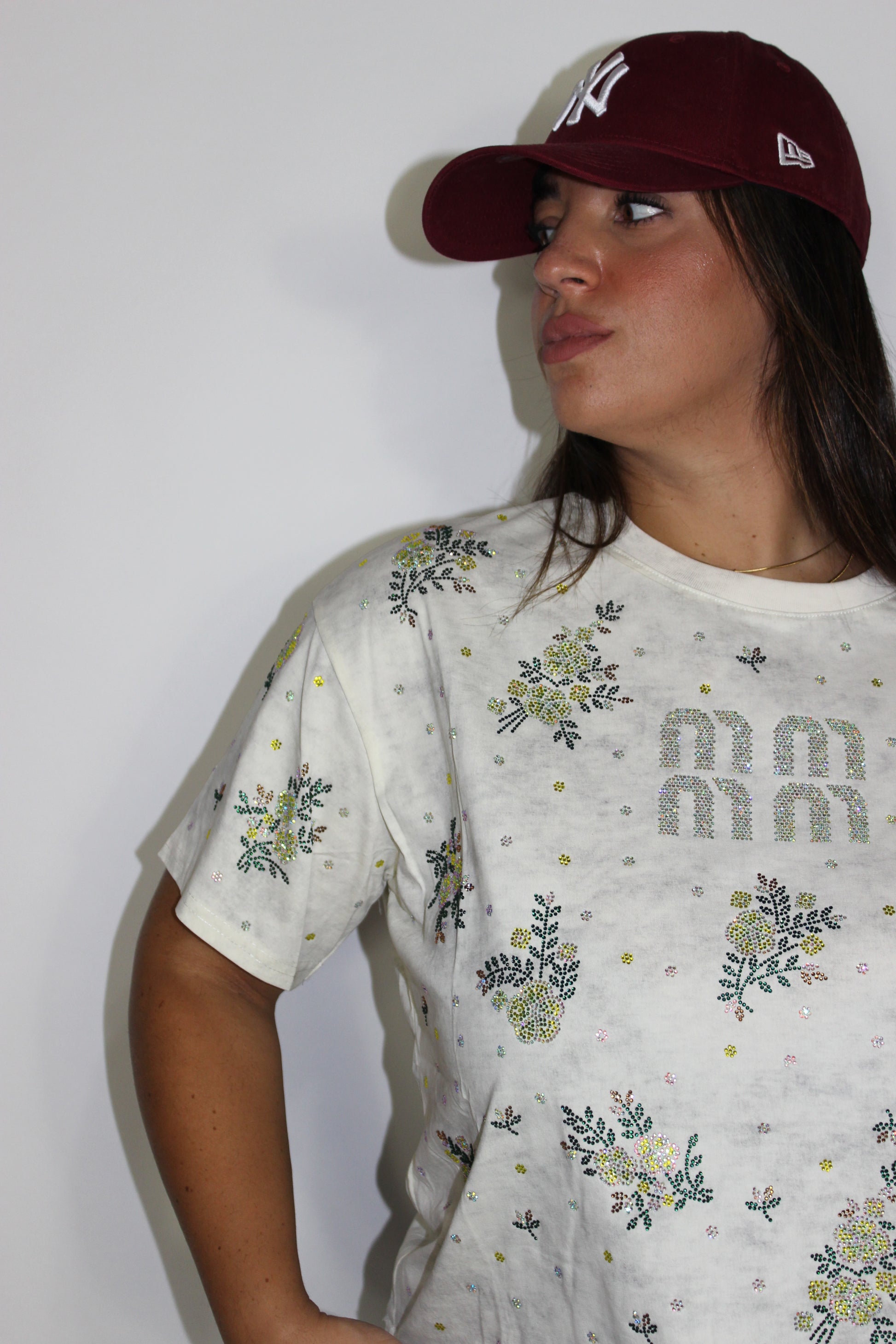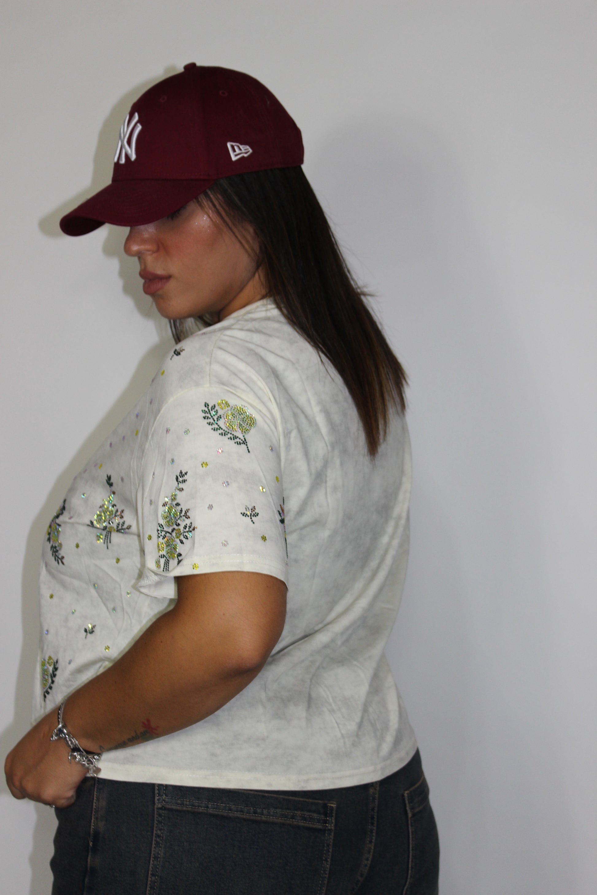 T-shirt in cotone con applicazioni strass. Taglia unica vestibilitá da taglia 40 a 54