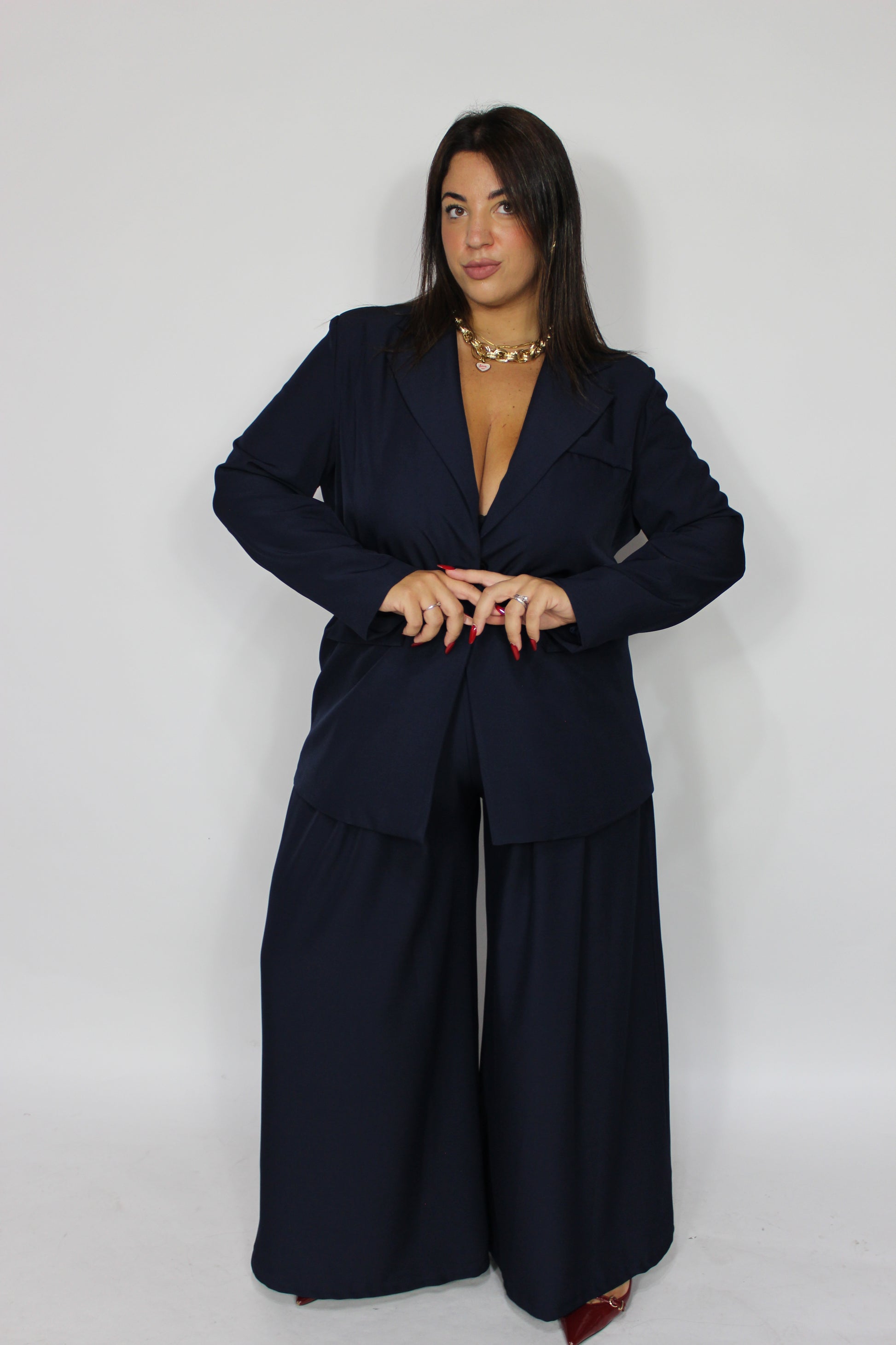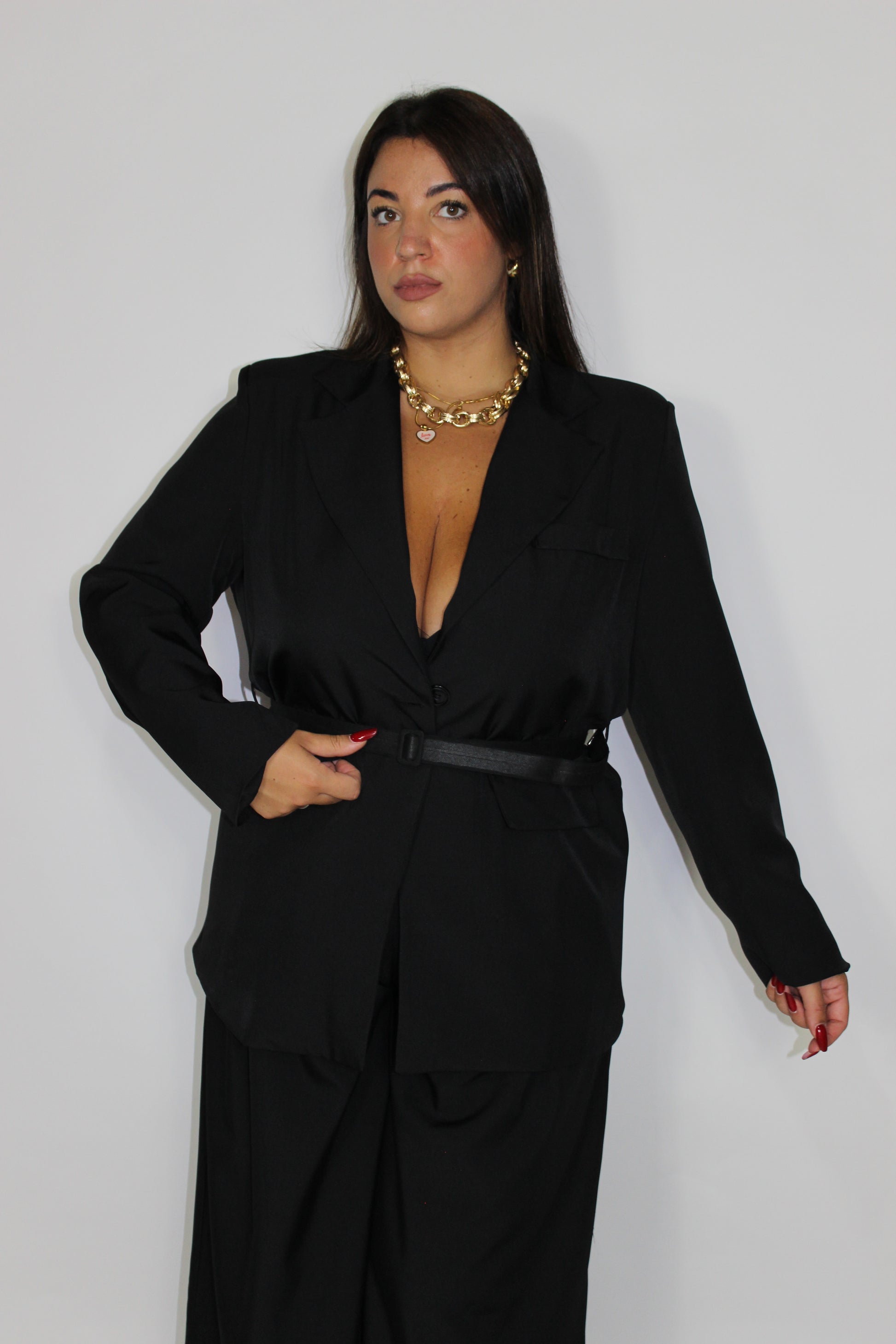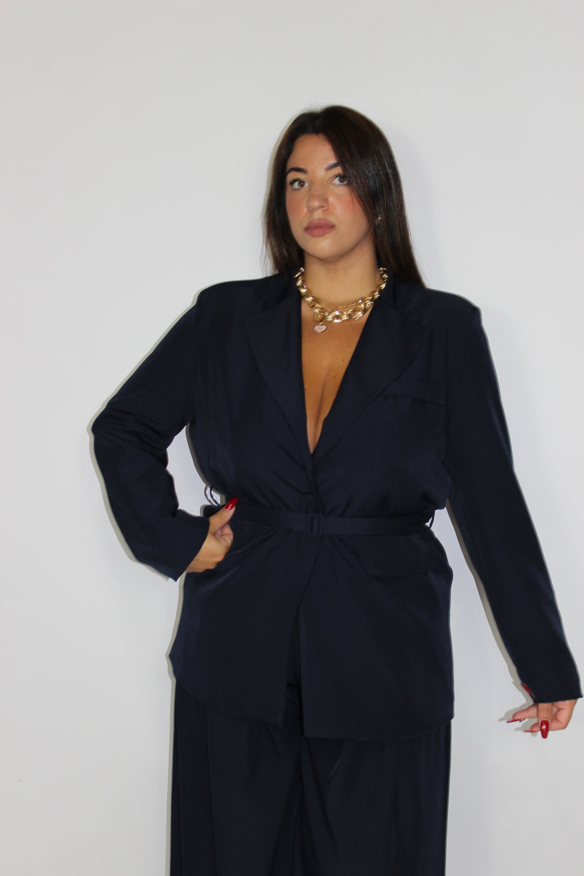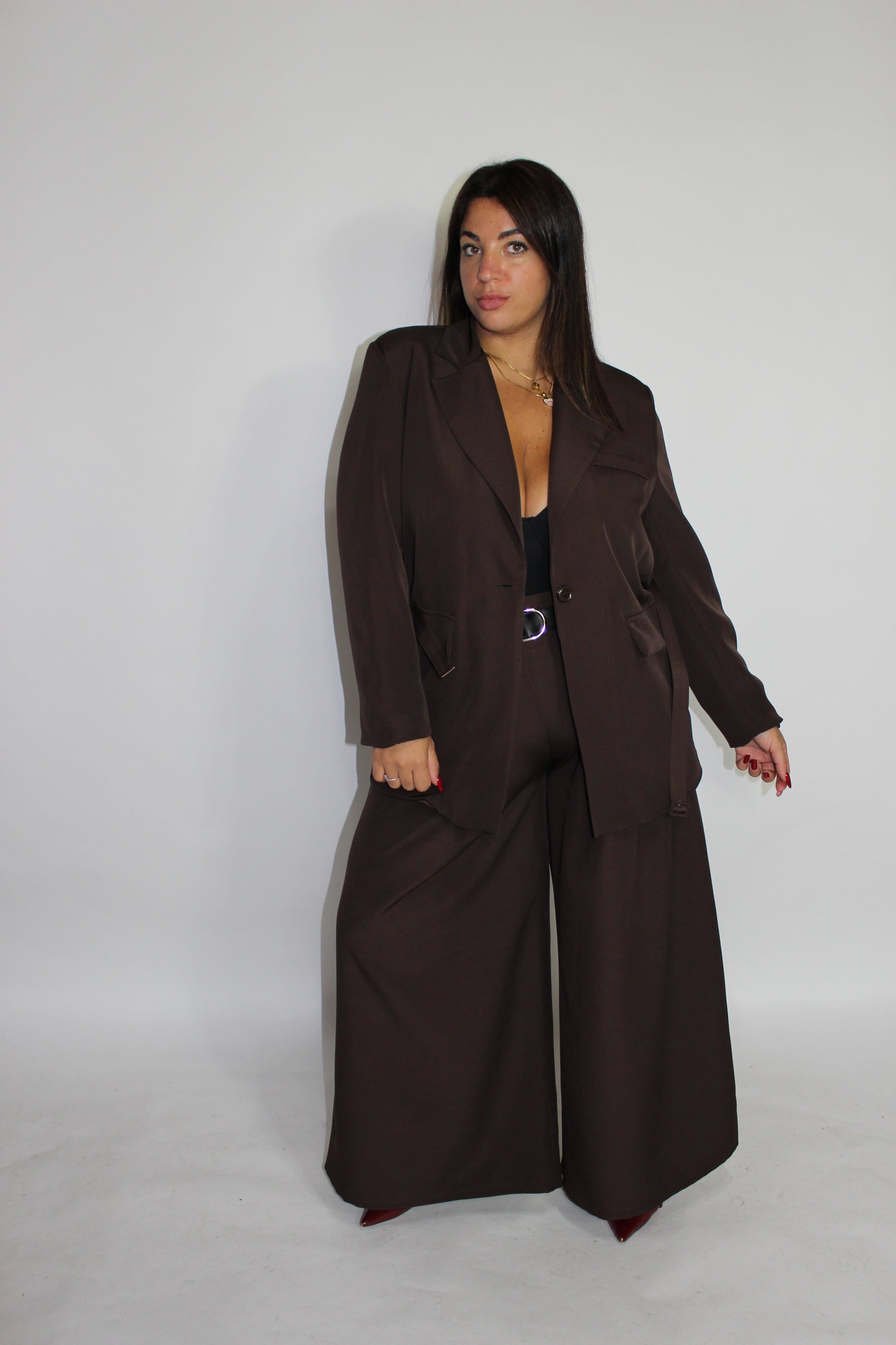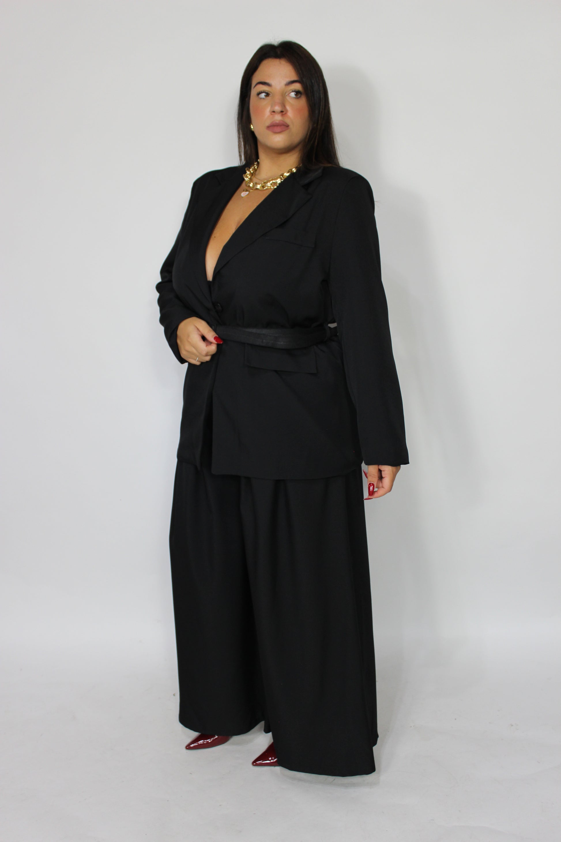 Tailleur giacca e pantalone . Entrambi con cintura. Il pantalone effetto gonna. Taglia unica vestibilitá da taglia 48 a 56