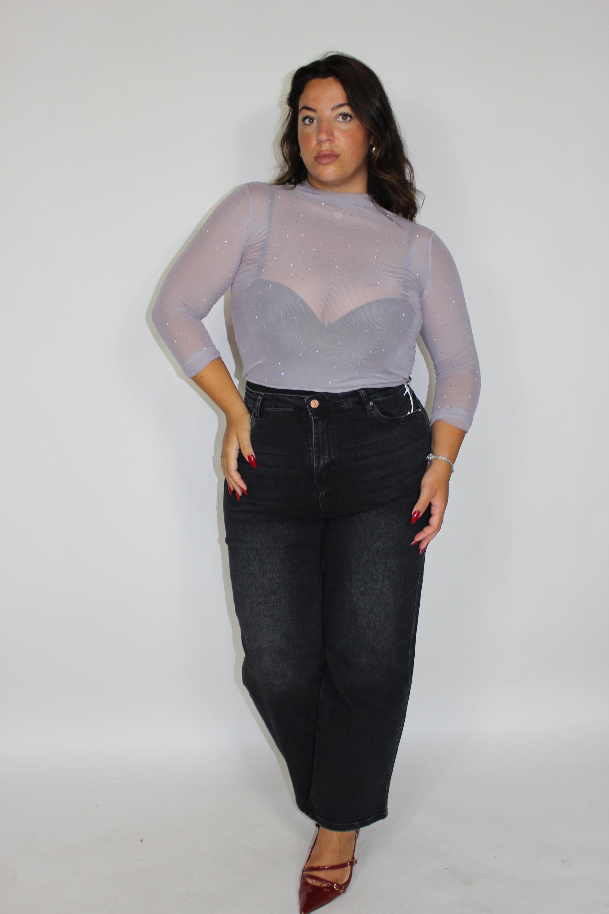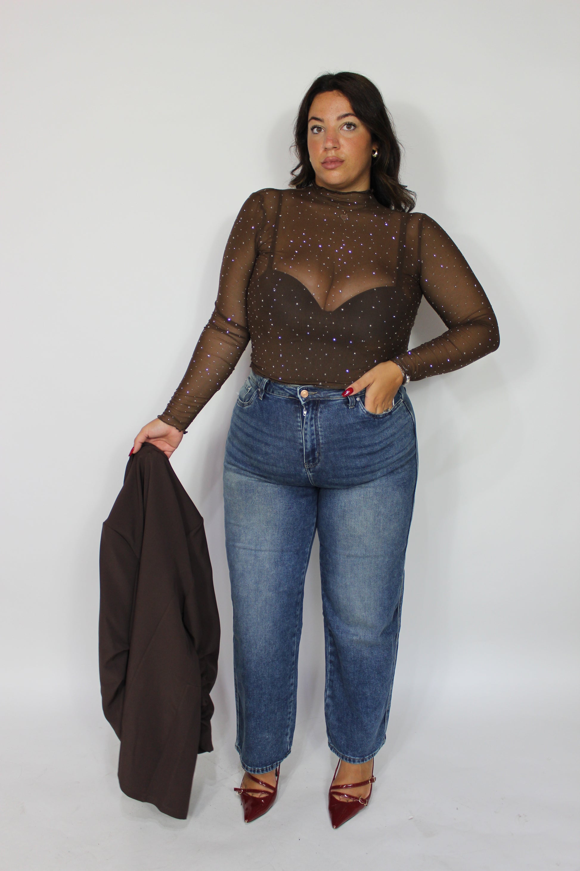 Top semi trasparente pieno di strass , anche sul retro. Tessuto elastico. Taglia unica vestibilitá da taglia 40 a 54