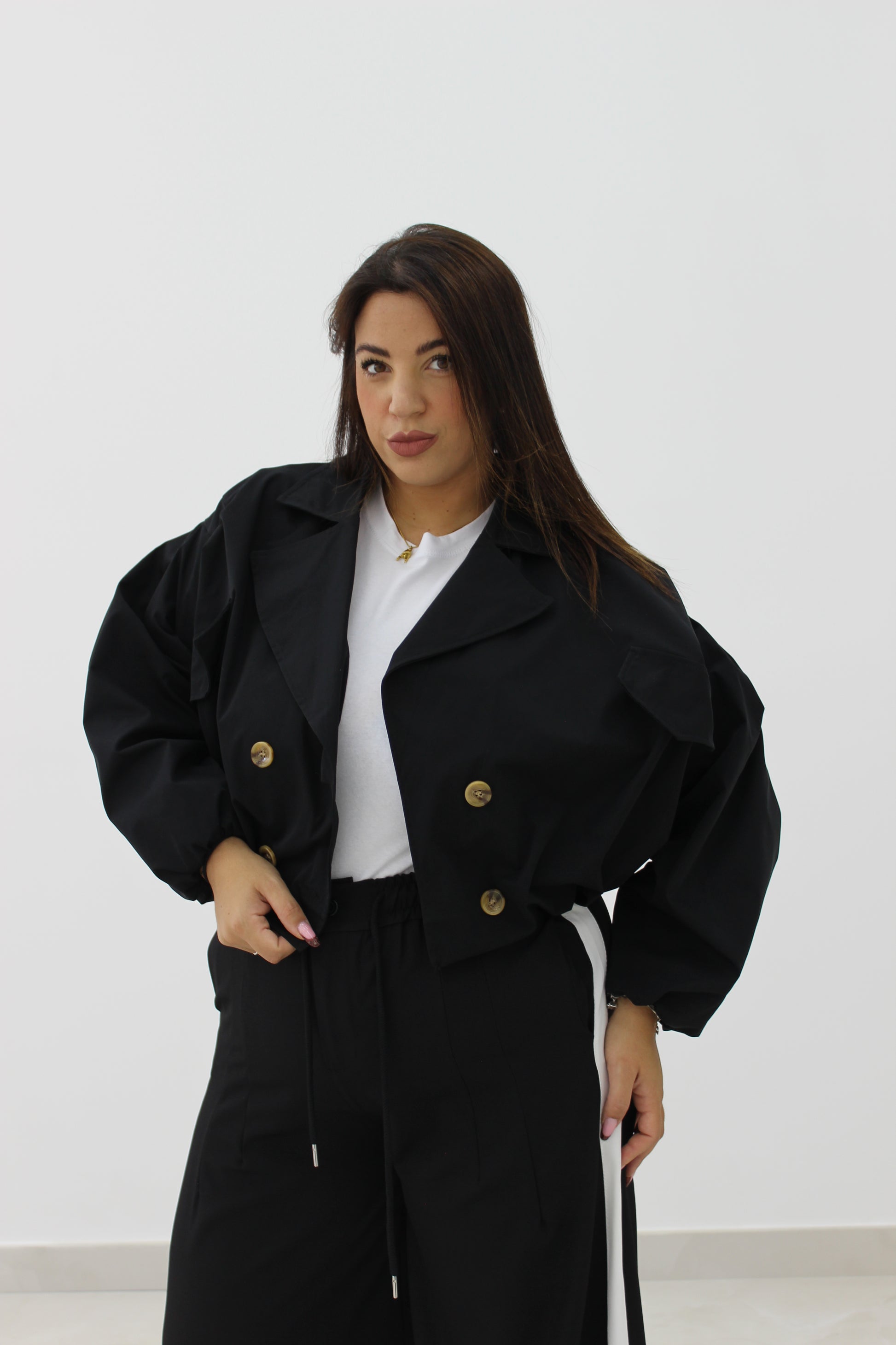 Trench effetto ballon crop. Doppio bottone ed elastico sul fondo. Taglia unica oversize con vestibilitá da taglia 48 a 56