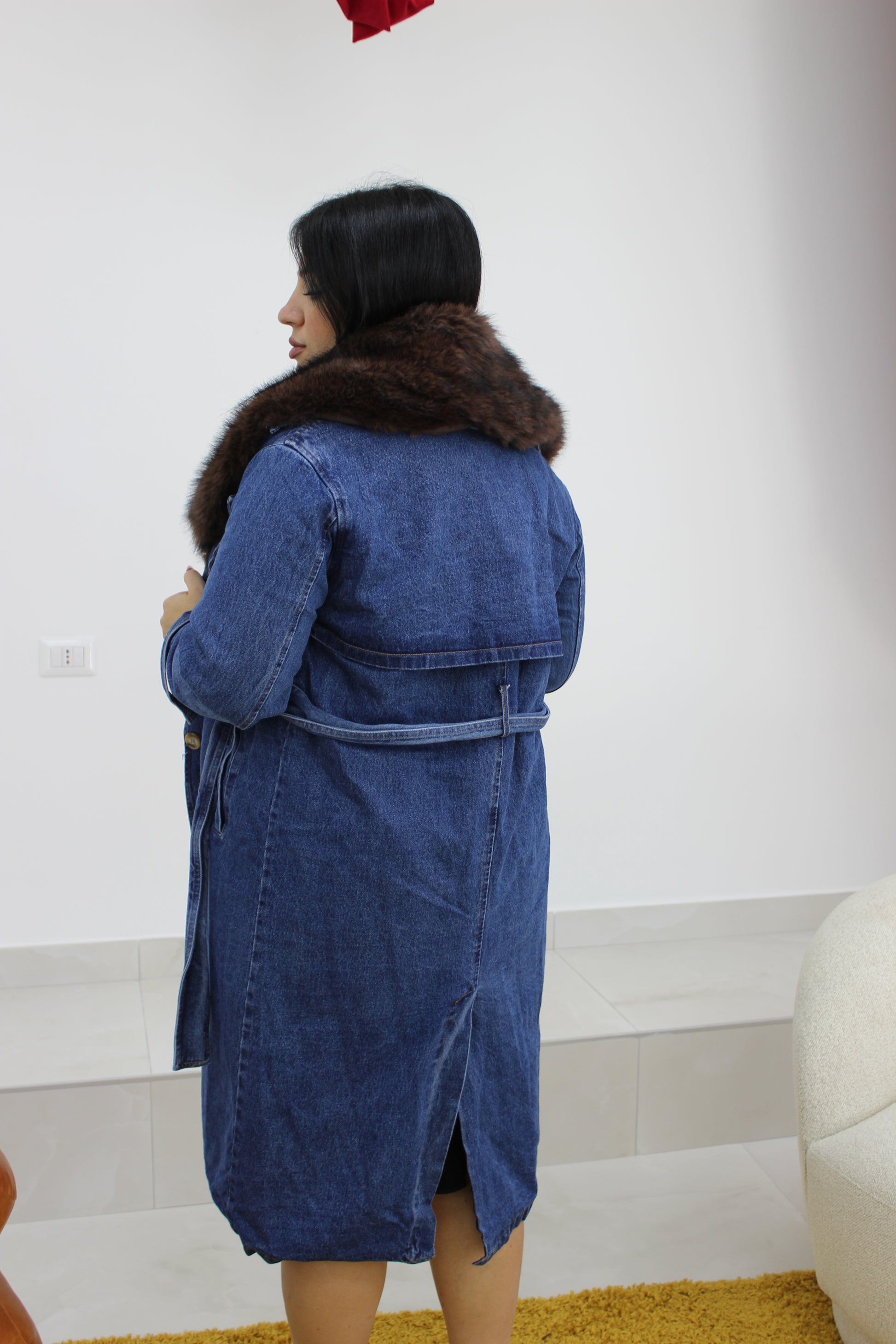 Trench in denim, piumino all’interno e collo in pelliccia rimovibile. Taglia unica , vestibilità da taglia 40 a 50